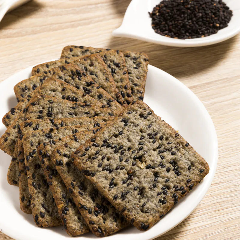 芝麻香氣除了來自麵糰裡的芝麻粉之外,更精選黑芝麻顆粒,滿佈於餅體上,透過隧道烤爐的均勻烘烤,天然飽滿的芝麻香,完美釋放。獨特的硬脆口感,不過度調味,呈現自然食材美感,幾經咀嚼,在清香中能品嚐到一種恬淡的優雅。